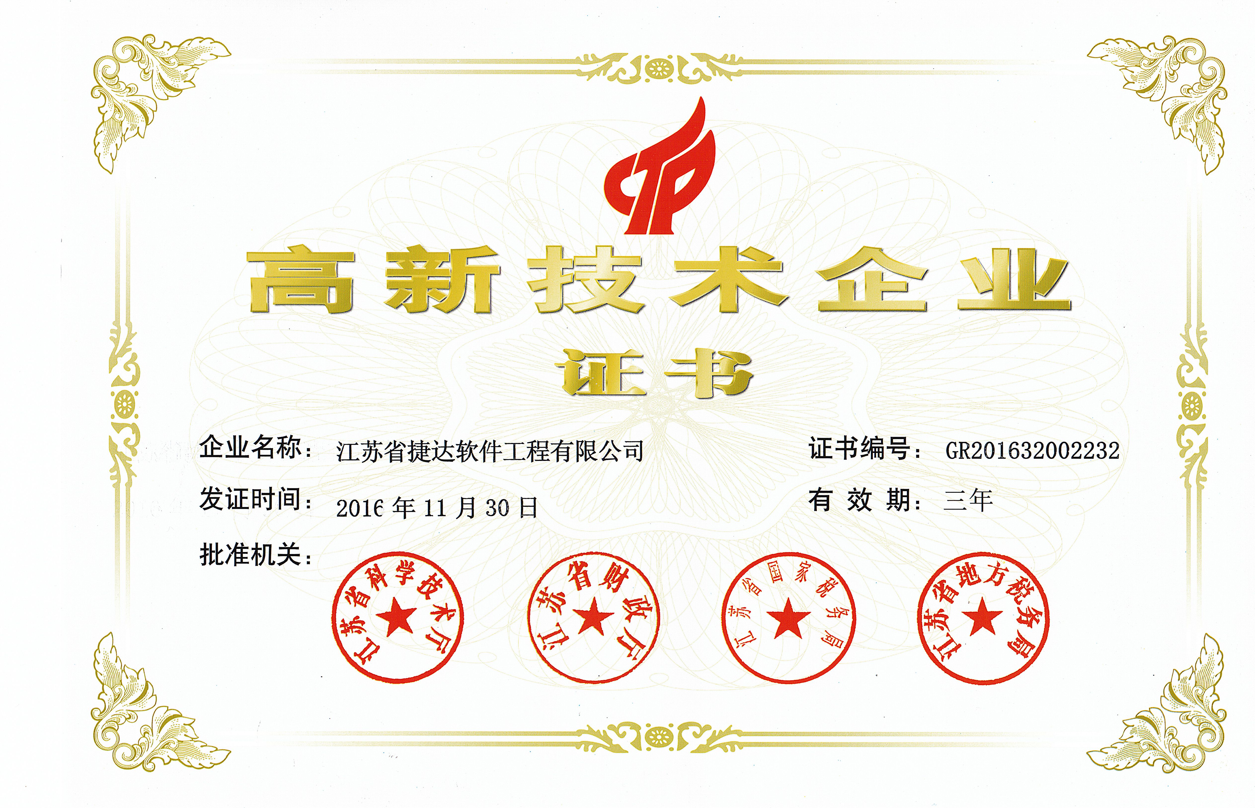 捷达软件与2016年11月30日,收到由江苏省科学技术厅、江苏省财政厅、江苏省国家税务局、江苏省地方税务局颁发的高新技术企业证书,公司顺利通过了高新技术企业重新认定。